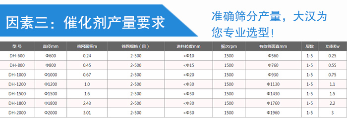 不同的用戶、企業、行業對催化劑的篩分處理量要求也是不同的,大漢機械所生產的能篩分催化劑的振動篩多大十幾種型號,產量小的就適用小型號振動篩(如:DH-400、DH-600型等);產量的的就適用大型號振動篩(如:DH-1500、DH-1800型等)您的準確篩分處理產量也是影響催化劑振動篩選型的重要參考。